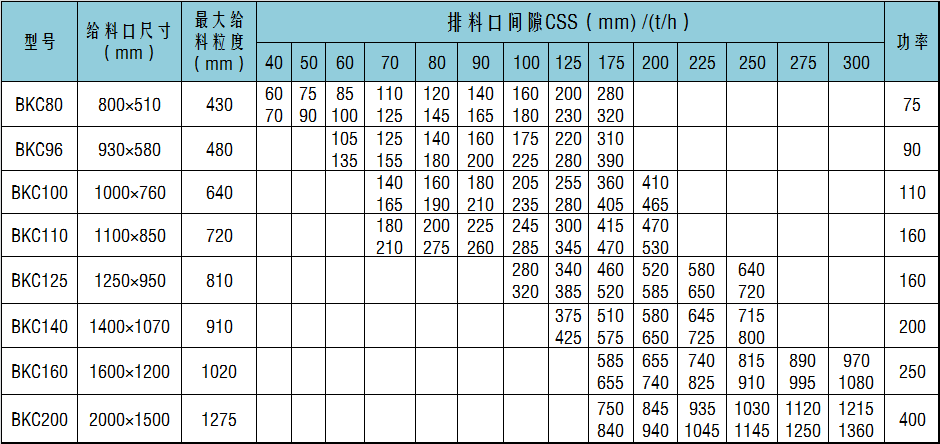 注:1.表中处理能力是破碎松散密度为1.6t/m³(石料密度2.7t/m³)的岩石对应的参数。2.根据物料性质、给料方式的不同,处理能力会随之变化。3.CSS为闭侧排料口,其测量方法据颚板齿形而定,不同的齿形,其处理能力和出料粒度会有变化。